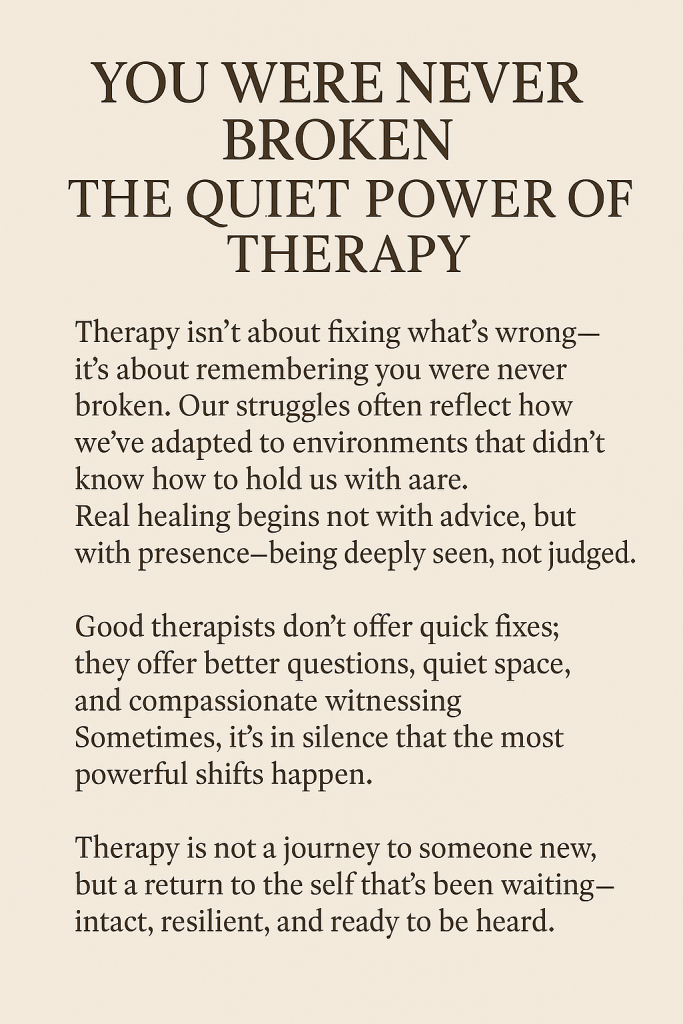 Therapy is often misunderstood as a process of fixing something defective—of correcting a “problem” in the individual. Yet this model reflects a broader cultural narrative that equates worth with perfection and emotional distress with dysfunction. In truth, therapy is not about fixing what’s wrong; it’s about remembering that you were never broken. Rather than being inherently flawed, many of our struggles are adaptive responses to environments that failed to meet our emotional needs. The power of therapy lies not in offering answers or advice, but in creating a relational space where presence, witnessing, and silence can bring what was once unspeakable into the light.