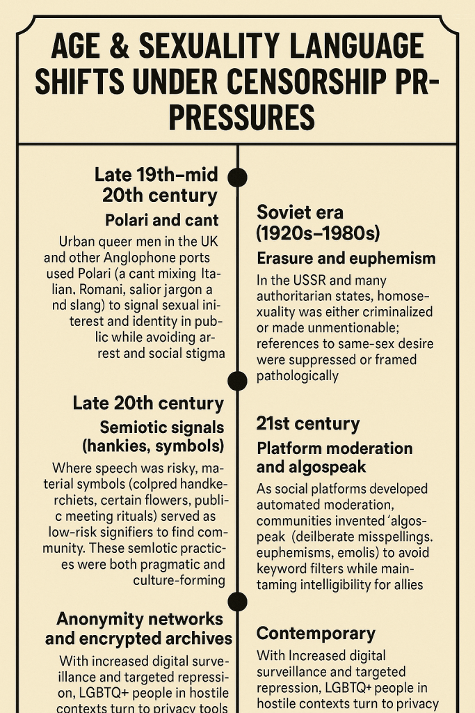 Late 19th–mid 20th century — Polari and cant: Urban queer men in the UK and other Anglophone ports used Polari (a cant mixing Italian, Romani, sailor jargon and slang) to signal sexual interest and identity in public while avoiding arrest and social stigma. Polari was prominent in public gay scenes until the 1960s–70s, when decriminalisation and mainstream visibility reduced its practical necessity. Soviet era (1920s–1980s) — erasure and euphemism: In the USSR and many authoritarian states, homosexuality was either criminalised or made unmentionable; references to same‑sex desire were suppressed or framed pathologically. This produced euphemistic, clinical or moralising language in official discourse and drove survivors to covert idioms and private networks. Late 20th century — semiotic signals (hankies, symbols): Where speech was risky, material symbols (colored handkerchiefs, certain flowers, public meeting rituals) served as low‑risk signifiers to find community. These semiotic practices were both pragmatic and culture‑forming. 21st century — platform moderation and algospeak: As social platforms developed automated moderation, communities invented “algospeak” (deliberate misspellings, euphemisms, emojis) to avoid keyword filters while maintaining intelligibility for allies. This is visible across TikTok, Twitter and other platforms. Contemporary — anonymity networks and encrypted archives: With increased digital surveillance and targeted repression, LGBTQ+ people in hostile contexts turn to privacy tools (VPNs, Tor) and hidden archives to access information, mutual aid and community safely. Organisations and the Tor Project explicitly connect anonymity to LGBTQ+ human rights.